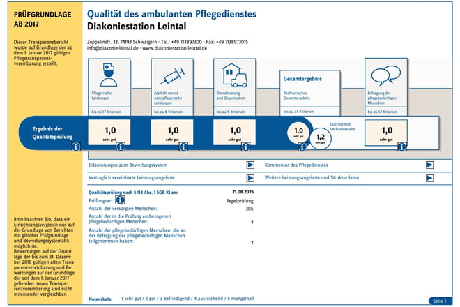 Diese Qualität wird regelmäßig vom Medizinischen Dienst (MD) überprüft. Dabei wird bewertet, wie gut die Pflegequalität in der Praxis umgesetzt wird – sowohl im Hinblick auf die pflegerischen Leistungen als auch auf die Organisation, Dokumentation und das Qualitätsmanagement. Am 21.08.25 besuchte der Medizinische Dienst wieder die Diakoniestation Leintal, um die Qualität unserer pflegerischen Leistungen zu überprüfen. Die Prüfung erfolgte nach bundesweit einheitlichen Kriterien und umfasste die Pflegedokumentation, die Qualität der erbrachten Leistungen sowie die Zufriedenheit unserer Kundinnen und Kunden.